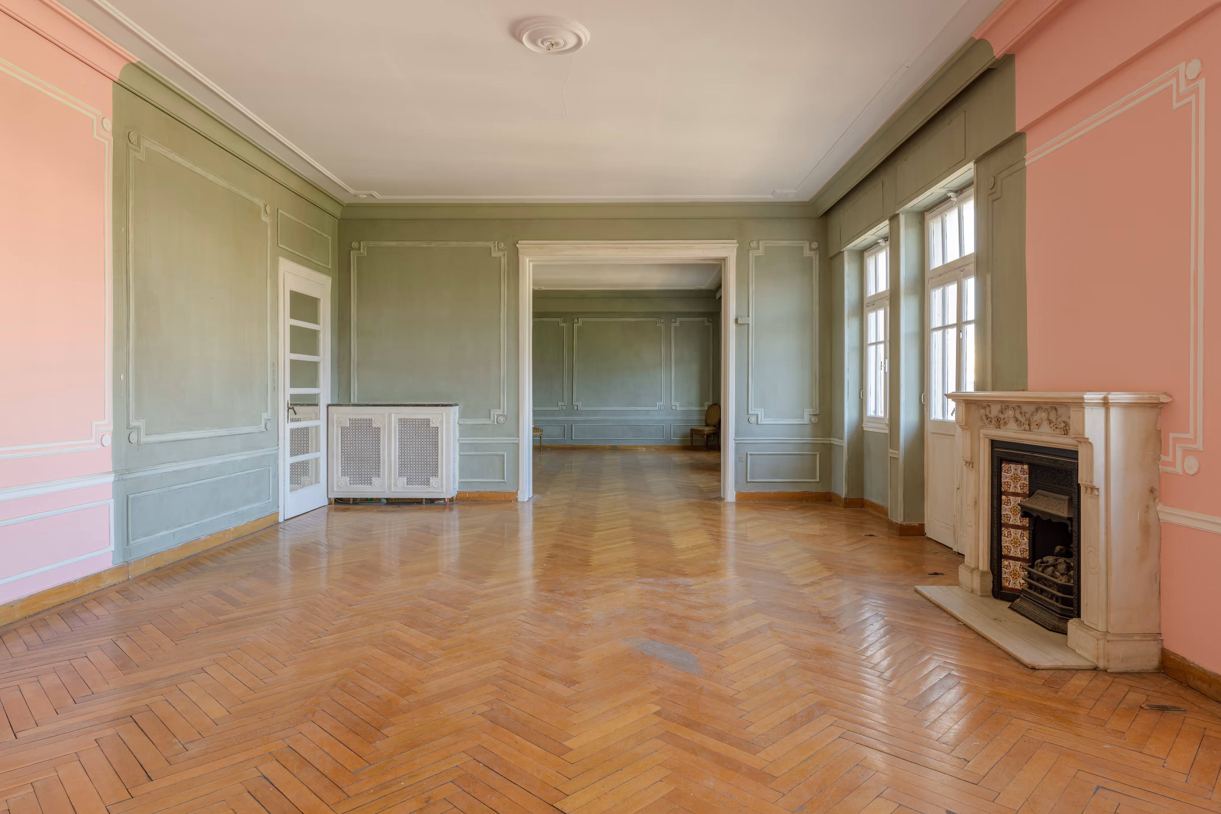 The building, designed by a renowned architect in 1925, features an impressive entrance and retains period characteristics such as high ceilings, ornate ceiling details, oak floors, and large openings that allow abundant natural light. The property is classified as a historic monument.