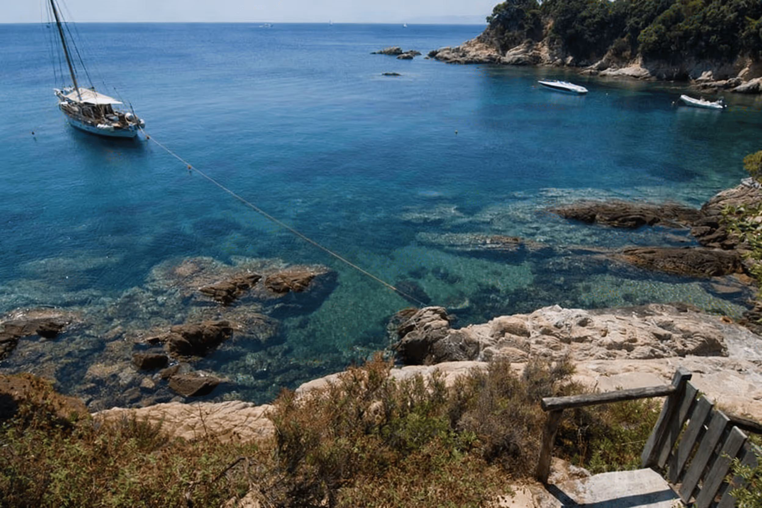 The main bedroom enjoys sea views, with a bathroom accessed via a walk-in hallway that includes two single beds suitable for seating, storage, or small children. Outdoor spaces include a long dining table with parasol and a shaded lounge under an old pine tree, where sea breezes and cool shade create a uniquely relaxing atmosphere.