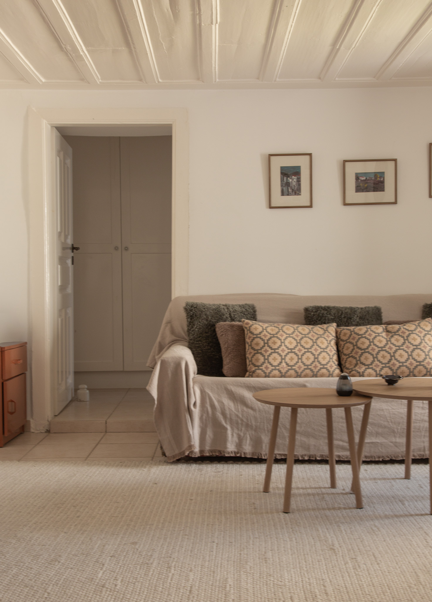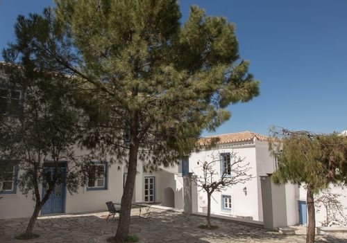Most coastal houses in Greece face the sea and close in October. This one faces inward, toward a large private courtyard shaded by mature pines, enclosed by three wings of whitewashed stone, paved in the uneven slabs that only time produces.