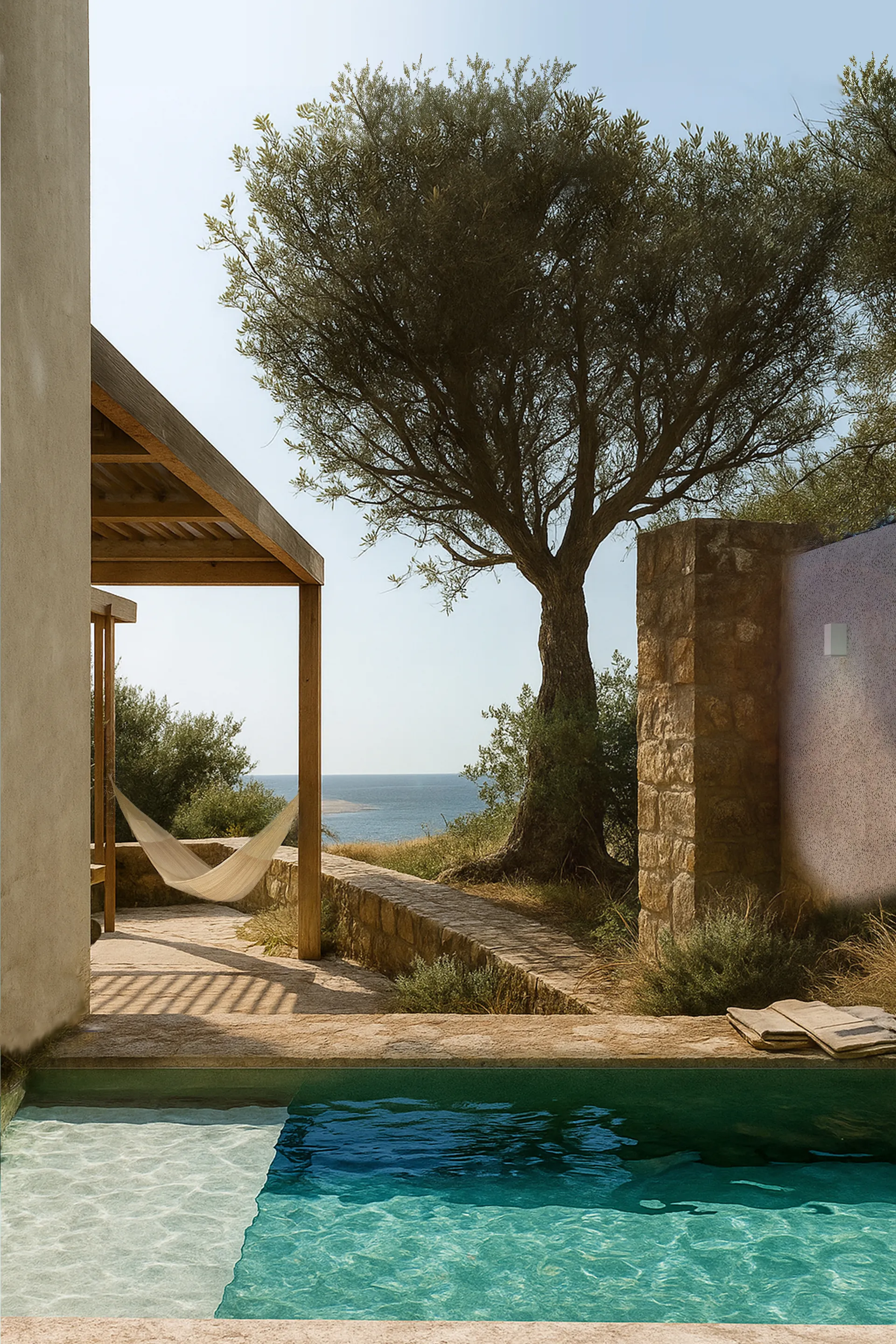 Situated amidst olive trees and native vegetation, the Meraki Houses are a peaceful haven in nature. The architecture and construction methods are chosen to complement the local context, creating a harmonious relationship between the built environment and its surroundings.