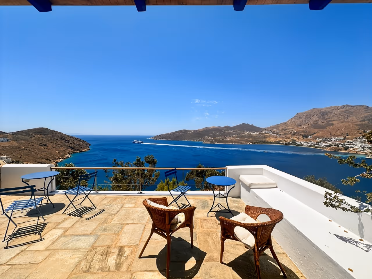 Every room enjoys unobstructed views over the Aegean and the bay of Livadi, while the spacious 36 m² main terrace and enclosed garden invite you to relax outdoors, shielded from the wind.