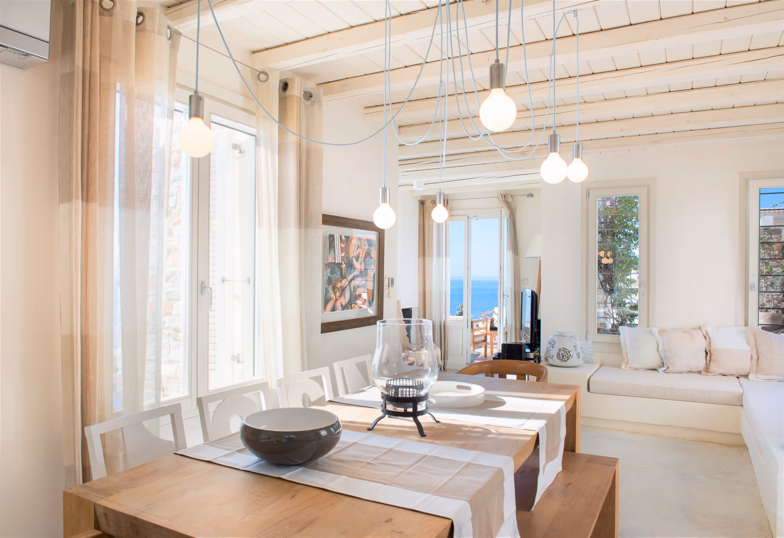 An additional fifth ensuite bedroom is also on the lower level, accessible from the outside, enjoying thus increased privacy. All bedrooms enjoy sea-views, even from the inside. On this level there is also a small kitchenette to prepare your coffee or tea, along with a second fridge.
